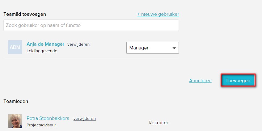 Op de 'team' pagina van het vacatureproces kun je het vacatureteam samenstellen die toegang heeft tot de vacature. Dit kunnen enkel recruiters zijn, maar je kunt er uiteraard ook voor kiezen om andere collega's toegang te geven.