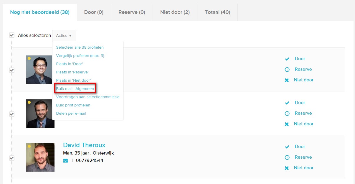Je gaat op een willekeurige tab staan (m.u.v. 'totaal'). Je selecteert de sollicitanten die je een algemene bulkmail wil sturen en kiest vervolgens 'Bulk mail | Algemeen'.