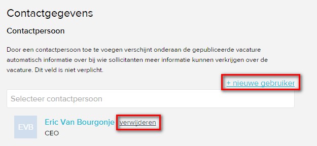 Onderaan de vacaturebeschrijving vind je een kopje met 'Contactgegevens'. Bij het sub-kopje 'contactpersoon' kun je extra contactpersonen toevoegen aan de vacature. Ook is het mogelijk om de huidige contactpersoon te verwijderen.