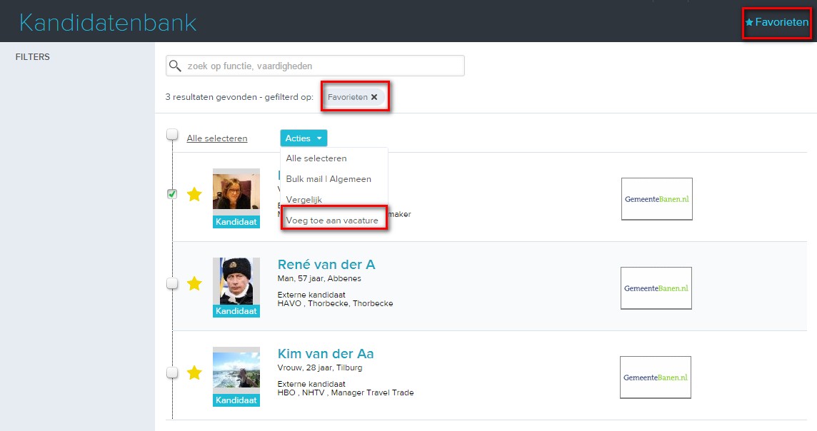 Wanneer je op de ster aan de linkerkant van de kandidaten klikt wordt deze opgeslagen als 'Favoriet'. Wanneer je dan rechtsboven op 'Favorieten' klikt krijg je een overzicht van de kandidaten die je hebt bewaard als favoriet. Deze zijn dan eenvoudig te selecteren en toe te voegen aan vacatures.