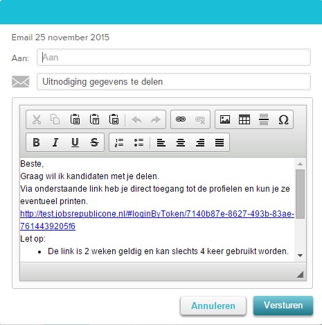 Je selecteert de kandidaat die je wilt delen en kiest voor 'Delen per e-mail'. Er Verschijnt een popup mail met een tokenlink die je kunt sturen naar de contactpersoon.